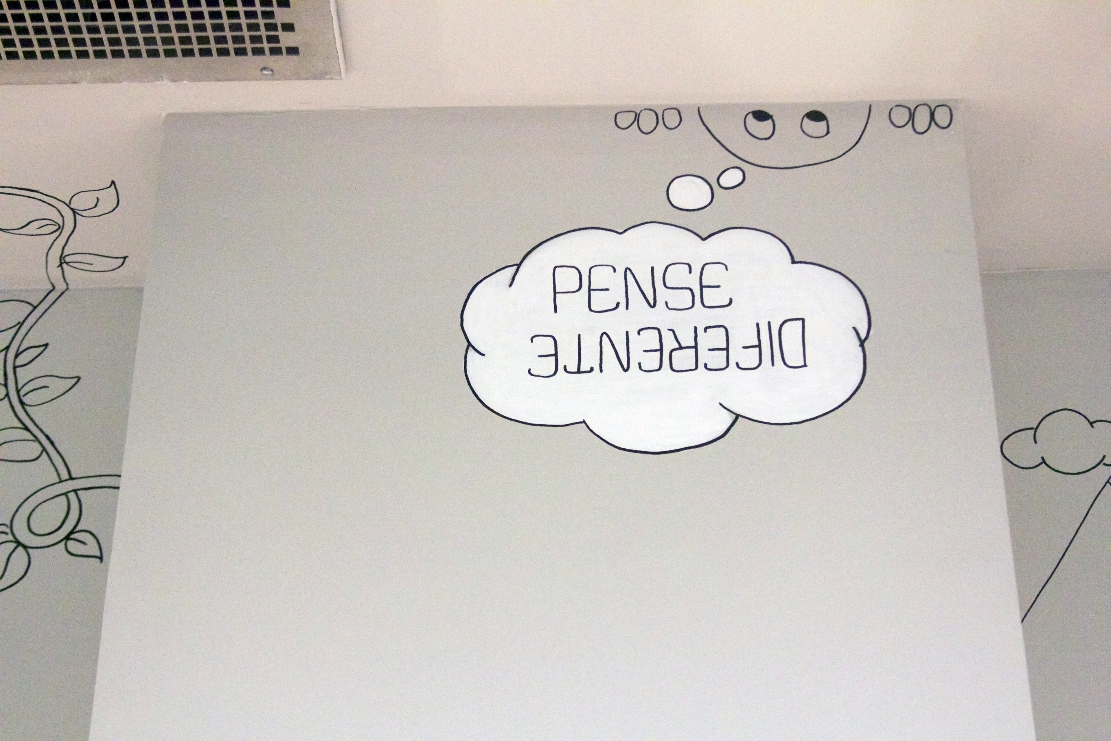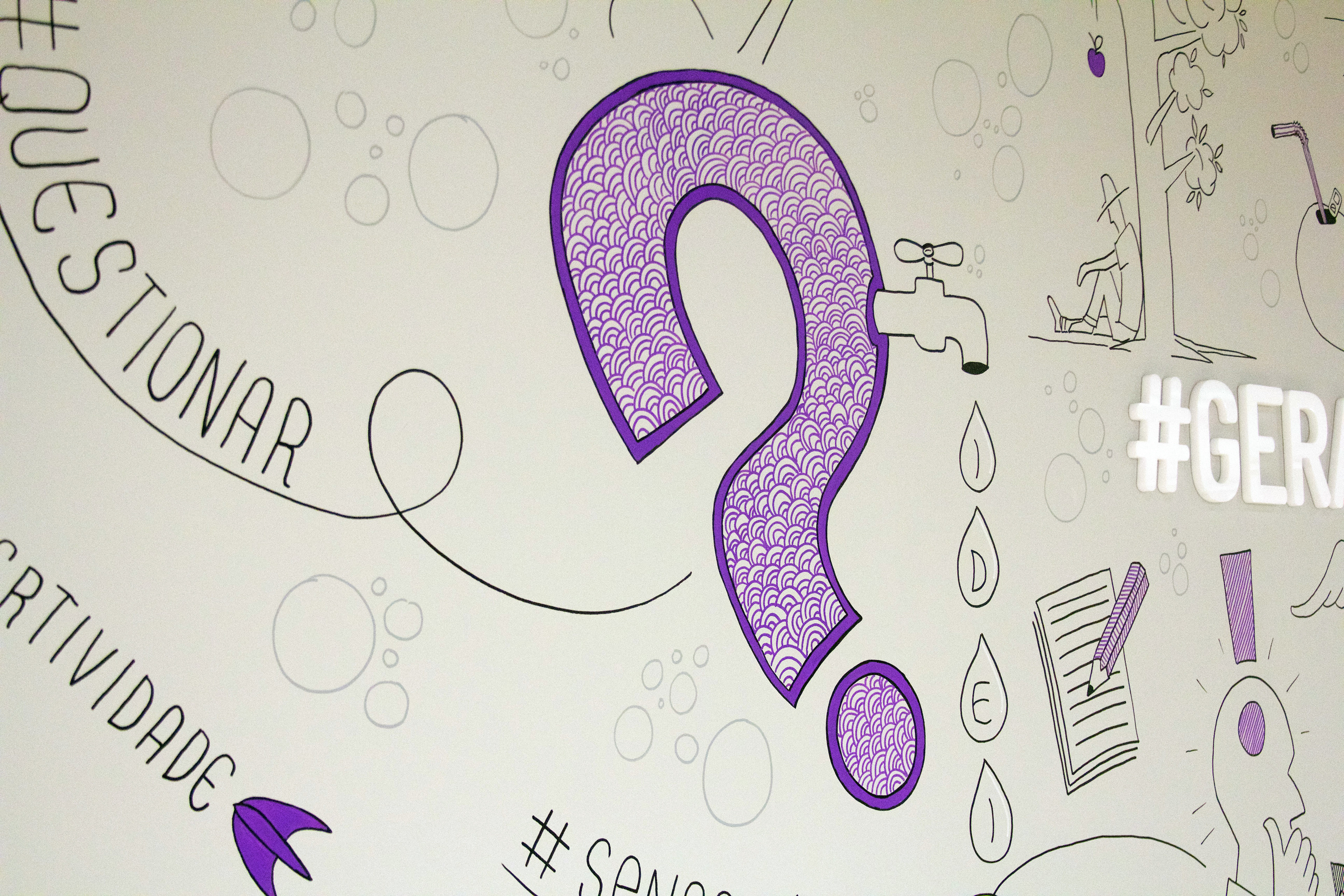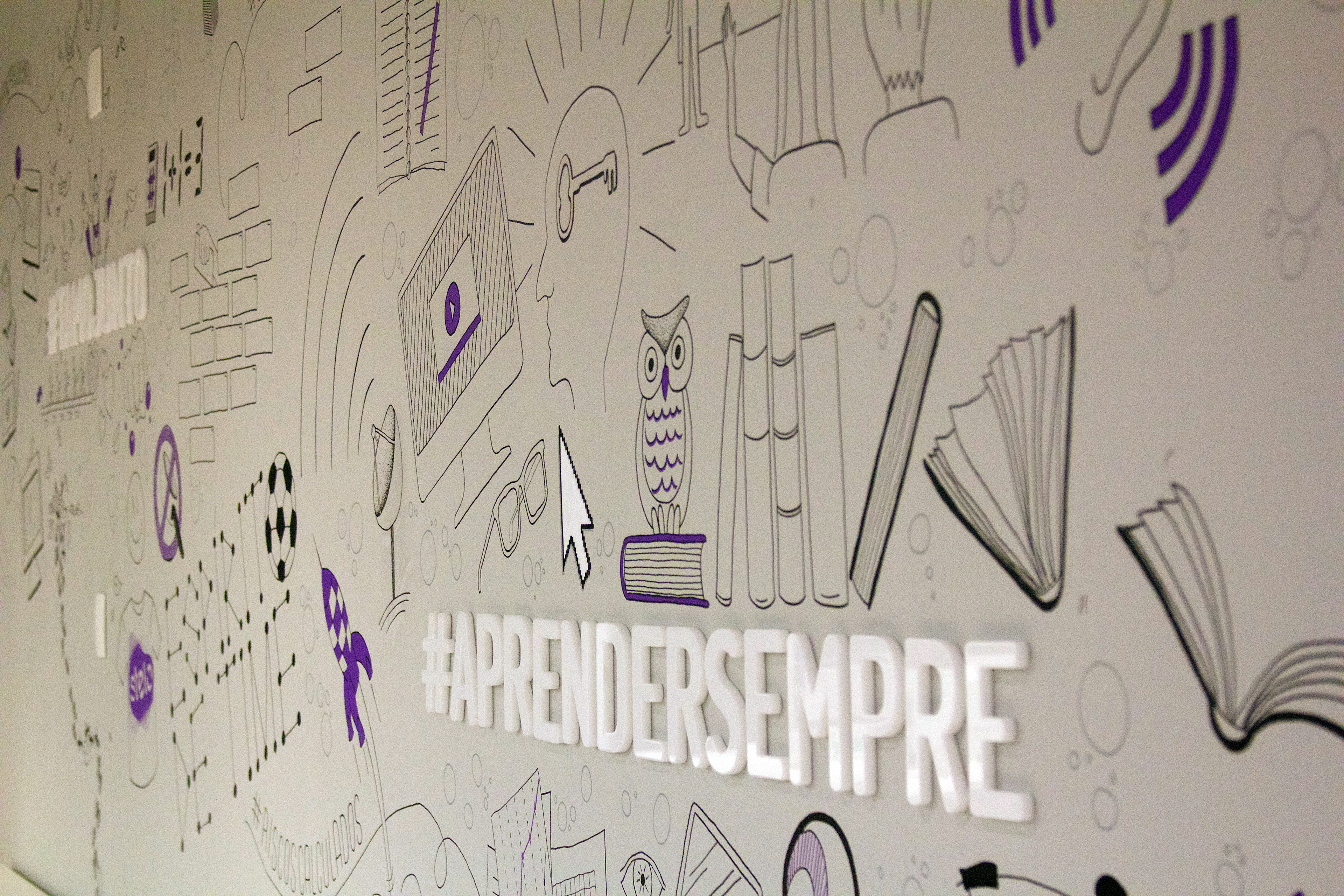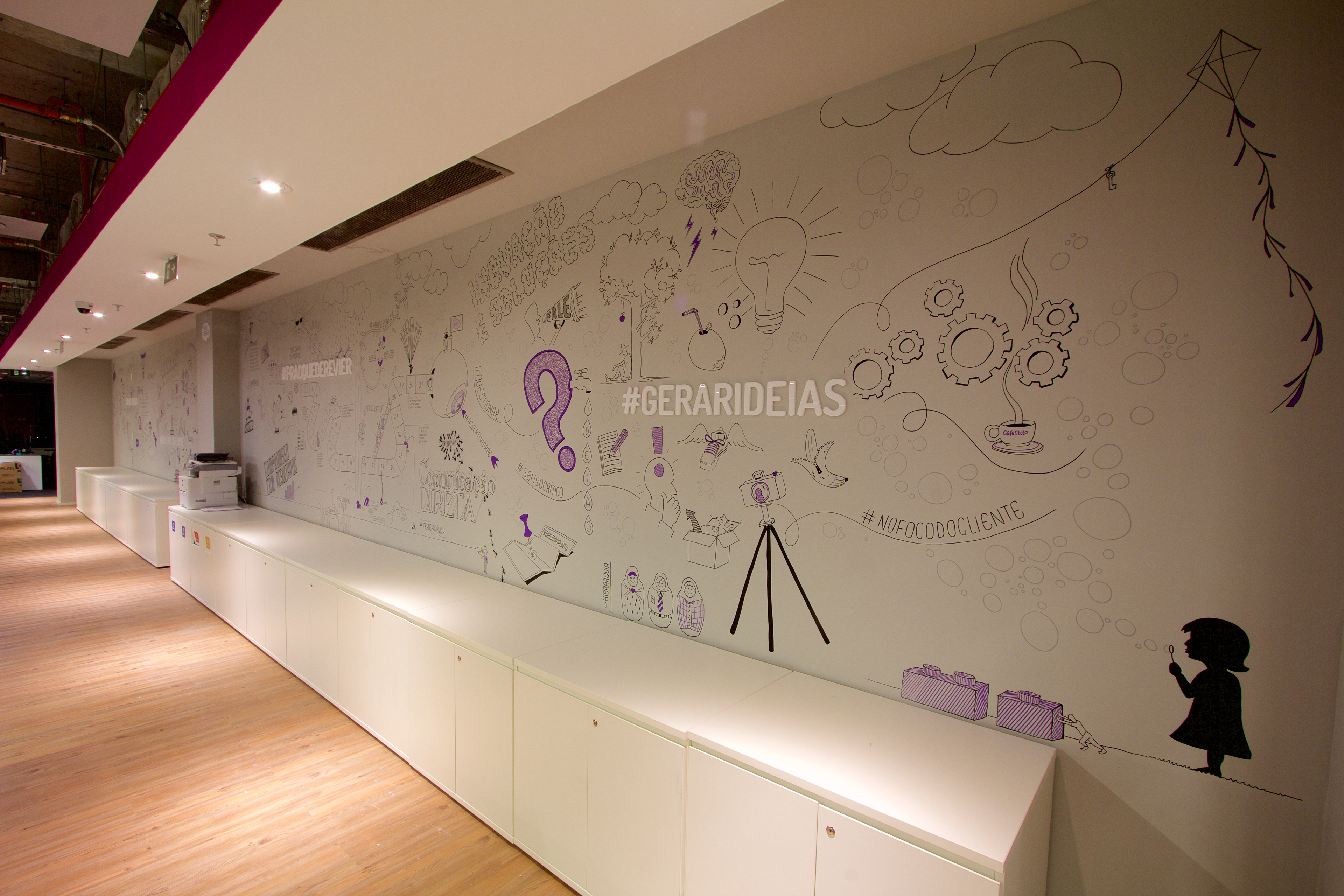 Ilustração feita à caneta em uma parede de 14 metros na empresa Stelo
